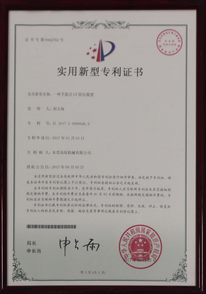 手提式UV固化裝置專利證書