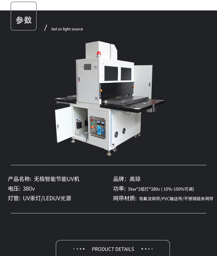 產(chǎn)品規(guī)格:生產(chǎn)廠家:高瓊產(chǎn)品名稱:無極智能節(jié)能UV機(jī)電 壓:380V功 率:5kw*2組燈功率調(diào)節(jié):10%-100%燈 管:UV汞燈/leduv光源網(wǎng)帶材質(zhì):鐵氟龍網(wǎng)帶/PVC輸送帶